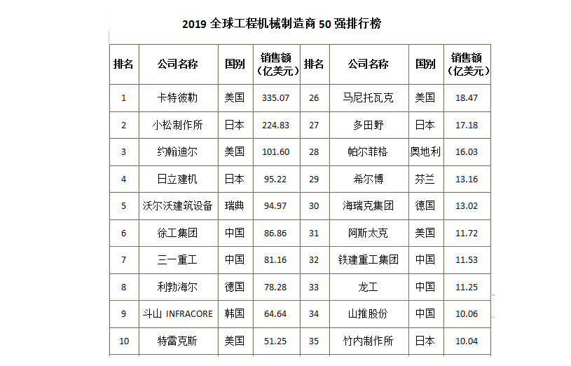 会议期间,组委会发布了在业内极具公信力和影响力的“2019全球工程机械制造商50强、100强”、“2019中国工程机械产业影响力100人”、“2019全球起重机制造商10强”、“2019全球、中国塔式起重机制造商10强”、“2019全球、中国高空作业设备制造商10强”、“2019全球矿山设备制造商10强”、“2019中国工程机械代理商10强”等多个榜单。卡特彼勒作为全球工程机械的领头羊继续荣登榜首。