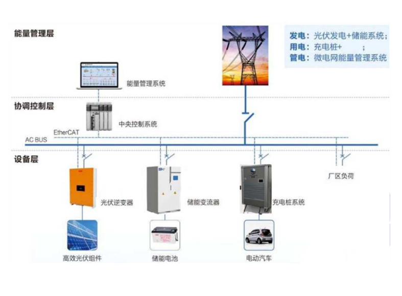 储能系统主要由柜体、空调、储能双向逆变器(PCS)、电池含 BMS 系统、能源管理系统(EMS)、电气高压箱、消防系统、安全辅助系统及配电系统等组成。利用电池储能系统的电能双向流动以及峰谷分时电价,即电能“低价储存,高价使用”,一方面实现充电桩供电低成本,另一方面还可以在高峰电价时段减少本地负荷用电量,节省了电费。